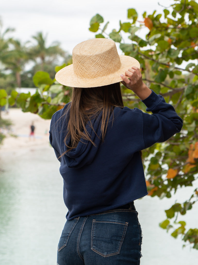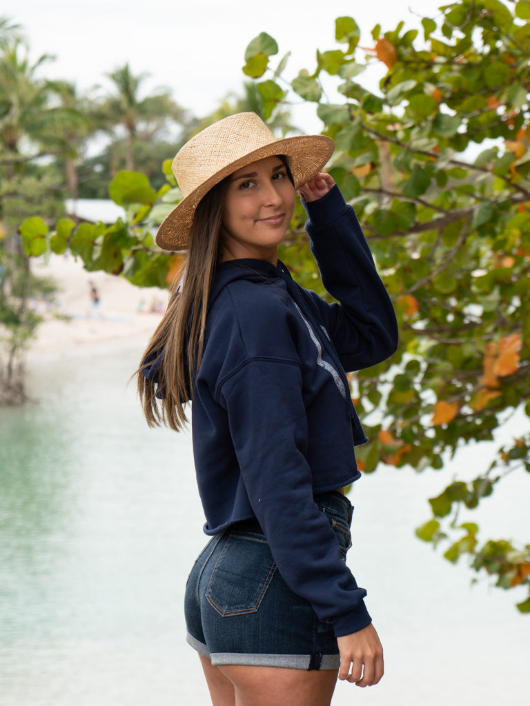 This trendy women’s cropped hoodie sweatshirt is a must-have for your fall wardrobe. Its raw edge and dyed to match drawstrings make it fashion forward while the poly cotton brushed fleece brings an unmatched level of comfort.